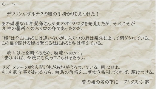 「エリックへ。9つの社を探索してみたよ。V」