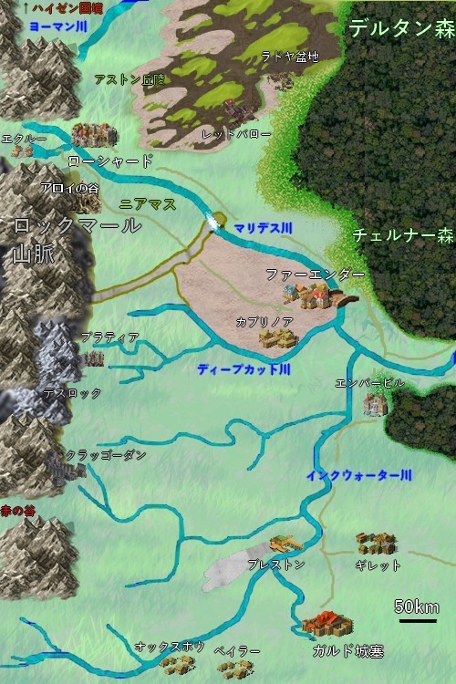 | ●A.I 240/10/1 午前 チェルナー森・トレヴァレイ砦 GM:一応でははじめますかー。買い物しながらでーw はじまりはじまりー。18回 ロクム:うむ レイシス:はーい GM:今回から、ようやく「第三章」です。森編でなくなるよ!w アレクセイ:はいー、意外とお金溜まってた。 レイシス:おぉ、岩山とか? GM:というのはですねw ではざっと説明を。地図だしましたー。ちと拡大してみてください。今までのレンジャーの3つの砦ですね。んで、この三つの砦はついに味方の基地となって、今レンジャーたちが再編されたばかりですね!(↑の地図) 前回から、2週間ほど経った、10月の秋となりました。 GM:んで、食料確保とかは他の人がやってくれるので、君たちは今は森にまだいるらしい残党退治しつつ、西へ・・というのは左に、ラドヤ、レッドバローってありますよね? レイシス:はい。街ですっけ? GM:ここはまぁ町ですね。そんなに大きくないですけど。貴重な鉱山がある、鉱山町なんですよ。このあたりをアストン丘陵といいます。あ、こっちの地図のほうがわかりやすいか。 ![]() レイシス:なるほど GM:ちなみに、この北の川、ずーっと下ると、山脈を通って、前回のハイゼンの領土になりますんでw GM:んで、ローシャードっていう、大きな都市があるんですよ。わかります? レイシス:ここは、都市なんですね。ラドヤも都市ですっけ? GM:ここが、昔からここを起点に死の谷が発展していた場所なんすね。あ、ラドヤは町・・小さい町ですw。 アレクセイ:これ全部「ハイゼンでも他の国家でもない」? レイシス:なるほど GM:なにせ、ローシャードが一番ここらでは大きい。そう!ここらは全部「独立都市」なんですよ。それまで、ユマ王国だったけど、滅亡後は独立。ハイゼン領だった時期もあったけど、オークらに敗北後は独立しました。 GM:そういう意味では、君たちの故郷も独立した感じでしたね。ファーエンダーとか。 GM:なので、このチェルナー森を制圧して、だいぶ余裕が出てきた今、ローシャードと連絡するのがよかろうというのが、オーブリンやヤコブ(レンジャー隊長)の意見です。ついでにラドヤ、レッドバローの安否も気になりますしのう。 レイシス:ローシャードは、まだ、無事っぽいんですっけ? GM:そこもまだ不明です。 レイシス:ですよねw GM:なので、偵察がてら、これらの町や都市にちと使い(PCたち)という感じですかね?もちろん、連絡手段が容易になったようなので、森からいつでも軍隊が使えるようになりました。 レイシス:れんじゃいくんたち アレクセイ:交渉の条件とか、そもそも私らが交渉の窓口な証拠とか必要ですよね。 GM:そうすね。あとこれまだ、使うの先だから告知はしなかったんですが、これ「軍隊」コマです。詳細は、実は「軍隊ルール」ページなるものをtopからたどれるよう作ったので、まぁそちらで。今はまだ使いませんw ロクム:グリフォンで飛んでけばすぐだが、他にもドラゴンがいるか分らんしな GM:それに森は森で、まだ残党がいるんで、それらがいるかどうかもついでに見てきてほしいそうです。 ロクム:歩いていくか GM:まぁ空は空で見つかりやすいですしのう。 レイシス:一応、使い魔さんに空から見てもらおう。 GM:まぁ空も見張りながらですかねw ロクム:この砦に配置されている以上、他にもいるだろうしなグリフォン部隊 GM:はいw グリフォンはわりと確保されてますw レイシスも一匹とったしねw ロクム:俺も欲しいが乗れるのかな GM:一応乗れますよw ロクム:でもこいつら馬食うから維持が大変なんだよなー GM:というわけで、現状がわかったところで・・・買い物おわったかな? そうそう。燃費悪いし大食いなんで、そこがねw レイシス:もうちょっと。。。 GM:レイシスは召喚できるけど、普段乗っていくのはたいへんかもw 他の人はね ロクム:アレクが変身したのに乗るのが一番か GM:それもありねw アレクセイ:(シーンが変わる度に落ちるんだけど) レイシス:w GM:堕ちる前に着地せよw アレクセイ:いきなりイニシア振らされたりあるじゃない。 GM:まぁねw さて、というわけで偵察隊結成ですね。 アレクセイ:あと、燃費って点じゃマナぽ1.3本分なので持ち運びはともかく財政的にはウマの方がマシ GM:えーと、例によって、助っ人おひとりお選びください。手前に、候補3人いるので。アルディアス/シエリオ/ソーレン。 ロクム:ポケモン選ぶみたいな感じだな GM:アルディアスは前線向けのファイター。シエリオはスナイパーね。ソーレンは、なんとマジックマイスターに成長しました。 GM:そうw <ポケモン 三匹だしねwww レイシス:■下記買います ヤク(5)、ヒロポン(2)、マジックフィスト(+2→+3)、 儀式書(アーケイン・ロック、トラヴェラーズ・フィスト、ノック) レイシス:おぉ、マジックマイスター レイシス:ソーレンって、だれでしたっけ?。。。 GM:自分で命名したの覚えてないすかwww レイシス:あれ、、、、すいません。 アレクセイ:(マイスターは本拠で酷使した方が後で使う軍隊の装備の質が上がりそう)