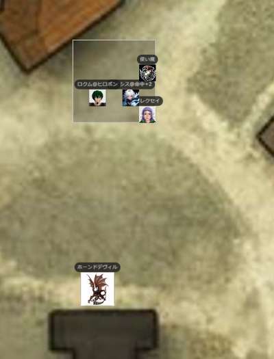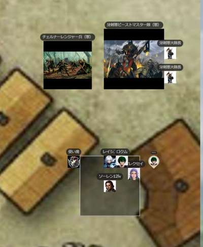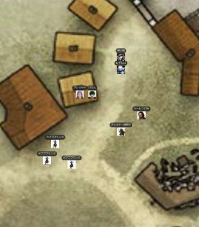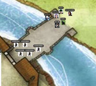 ●A.I 240/12/30 午後 ファーエンダー![]() GM:さて、今日は故郷ファーエンダーを実際に取り戻す回ですね!特にレベルアップもないし戦い続きなので、皆さん準備できたらはじめますー レイシス:はーい GM:あ、橋の向こうにいるけど、今回は攻め方は自由だからねw アレクセイ:あー、建築に詳しいドワーフを道案内に連れていけないかなー GM:用途による。ここの土地勘なら君たちのほうがあるぞw アレクセイ:建築というか、地底の方向感覚に強いって言うか。 ロクム:人間とドワーフの建築って同じなのか? GM:ドワーフはむしろダンジョン系かな アレクセイ:変に掘ると、地上物がどこかの道路みたいに落ちて来る。 GM:ちなみに前回、空行こうとしたらすげー悪魔が一匹いるので、あいつも何とかせねばって話でもありました。あ、黒曜石の塔なんで、地中から穴掘っていこうっつっても硬くてたぶん無理だよw アレクセイ:上手く立ち回れば城壁が崩れてくれるけど、自分の上に落ちるのはまずいw ロクム:行けたとしても入口までだな GM:それにさすがに故郷だし、君たちである程度地上の敵も一掃しないとですねw レイシス:手前までいければ、それでもいいかもですね。 ロクム:ソフンアンドストーンとかあれば行けるかもしれんが持ってないだろうし アレクセイ:村の中までLサイズの出入り口が開くんですから、そこから近接特化した騎士団が殴りこんでも良い訳で レイシス:取ろうとして、やめてしまった。<ソフン ロクム:俺とレイシスはテレポートできるから地上班でも良いけど アレクセイ:あー、マグマゴーレムで掘っていくの… GM:まぁ今回は戦争なんで、基本的な戦略は他の軍勢もやっている体でw 皆さんは皆さんの1グループとして、どう進むかだけでいいですよ~。もちろん一掃したほうが楽っちゃ楽w NPCはあまり期待せぬようw GM:あ、ちなみにこれは縮小地図なので・・実際行くなら、実際MAPだしますよ~。まずは、皆さんがどこらへんに進むかですもちろん、駐留しているようですね。向こうも軍勢を。 ロクム:目星も何もないからな GM:ま、中央の塔が最終的な目的地ですが、周囲をなんとかせねばでしょうね。この黒いのねw 今北の橋に集まっているけど、これも別にここからじゃなくてもいいわけで。 レイシス:外側の壁みたいなものは、結構、高いんですっけ? ロクム:川の方には壁は無いな レイシス:そうですねw GM:6マス高さですね!かなり高い(9m) レイシス:あ、そんなにあるのか ロクム:入らない限り中の様子は分からないか GM:ただ、木製ではあるw 一応空から見ようとした使い魔が・・前回あの感じですんでw ソーレン12lv:「川から行くのが常道ではありますね」 アレクセイ:川越えをもっと前にやって陸側から攻める人たちは? ロクム:ファイアーボール&マグマゴーレムごり押し作戦でもいいぞ レイシス:w ロクム:(俺もアミュレットでFB撃てるし GM:一応主力は←の門から攻めるみたいすね。騎士とか陸軍は ロクム:なら俺たちは逆から行くか GM:あと、半分は南から。川はそう、皆さんだけかな今は。 レイシス:じゃあ、川から上陸してもいいかも? GM:んじゃ川方面にいくでよろしいですかな。はーい ロクム:家が木造なら片っ端から燃やしていくか GM:マリデス川にかかる不気味な橋の西端は、頑丈な木製の門と石造りの要塞で塞がれている。いくつかの大きな焦げた染みが橋の美しさを物語っている。 ロクム:油と発火瓶と爆弾もまだあるし アレクセイ:どーせホブゴブが好き勝手した後なので景気良く焼いても、とは思ったんですけどね。 レイシス:ウォーターウォークでいったら、目立ちますかね? ロクム:やはり見張りはいるか レイシス:ここは、橋の上? アレクセイ:村中が火事になったら燃え無さそうなところに逃げると思いません?例えばあの塔とかw ロクム:櫓もありそう レイシス:塔は、燃えなさそう。。w ![]() GM:さて橋の上です! なんか屈強そうな5人の特戦隊がいますね。近寄るなら、まぁそのままイニシアですね。どうします? ロクム:隠密は無理そうか? レイシス:川の上を歩いていくと、やっぱり見張りがいそうですか? GM:隠密は、やってみないと!(判定 レイシス:橋を使わないで。 ロクム:1d20+8+0+8+2+5+5 【隠密】 <BCDice:ロクム>:DiceBot : (1D20+8+0+8+2+5+5) → 5[5]+8+0+8+2+5+5 → 33 GM:どっちのほうへ寄るか ですねw レイシス:たとえば、この辺 ロクム:隠密できるなら俺は橋から行くぜ GM:ばらばらは・・w レイシス:おぉ、橋からか・・じゃあ、橋でいきましょうw GM:はーい。では、隠密どぞー!したい方w レイシス:隠密プラス、能力:不可視転移: 全行動で、不可視(透明)になってからDEX修正分マスだけ瞬間移動できる。不可 視(透明)は次の本人の開始ターンまで持続する。 レイシス:できますかね? レイシス:1d20+5+0+8+5 隠密(DEX) <BCDice:レイシス>:DiceBot : (1D20+5+0+8+5) → 20[20]+5+0+8+5 → 38 GM:これははじまってからですねw レイシス:お、クリティカルだ。 牙剣軍特戦隊3:1d20+0+7 知覚 <BCDice:牙剣軍特戦隊3>:DiceBot : (1D20+0+7) → 12[12]+0+7 → 19 レイシス:了解です