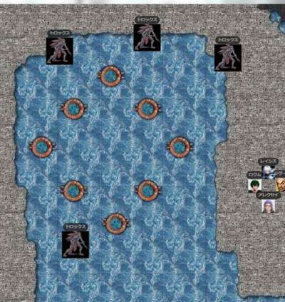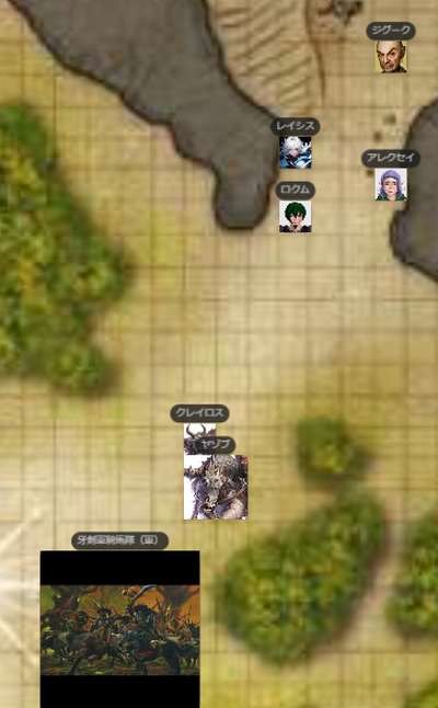 | ●A.I 241/1/3 朝 ヴォルト地界、ペック集落。 GM:前回、ここを創造した古代魔法使い(オールドマスター)ジグークの安否を確かめようとしたら、実は彼はもはや死んでいて(悪い魔法使いだったw)、その肉体は「イコール」という、もはや回虫みたいな外観になった精神のみのもう一人の古代魔法使いが身体を支配しましたとさ ロクム:ややこしい レイシス:うむ ロクム:4人いたオールドマスターで生き残ってるのはこの人だけなのか レイシス:たしかそうですよね。 GM:はいw まぁともかく地中人ペックと仲良くなった君たちは、このイコール(まぁ外観がジグークなので、ジグークに成りすますことにw そう、もう彼しかいないようです。 ジグーク:「まぁともかくだ。今はその侵入者とやらをなんとかせねばならんのは確かだな。」 ロクム:「一応聞いとくが、帰れる方法知ってるか?」 ジグーク:「いや・・もしかして作り替えられたかもしれん。わしがやってみたが、だめだった。別のゲートが開いているのじゃろう。おまえたちで、帰り道を探さねばな。」 ロクム:「倒してから考えるしかないか」 レイシス:「そうみたいだね」 長老セブレナー:そのときだ!「むう、大変じゃ」 ロクム:「今度はなんだよ」 レイシス:(とりあえず、長老のところにもどってたか。「なにが、大変?」 長老セブレナー:「ジグークどの。ようやくここへ現れてくださったのに、悪いが・・またあいつら・・牙剣軍の軍じゃよ!」 レイシス:「また、洞窟の外にきた?」 長老セブレナー:「外へ出てみればわかる」 レイシス:ちらっと、外を見に。 ロクム:どれどれ GM:そこは、なんか変わった軍の騎馬隊だw ロクム:いっぱいいるな レイシス:なんかすごい、強そうな方が。。 GM:率いるのは、なんかすんごい獰猛そうな牛モンスター?に乗った、ホブゴブリンだ GM:その後ろに牙軍隊ね ![]() クレイロス:「我が名はクレイロス! どうやらシャギブめを倒したときいて、急遽やってきたぞ!あの魔人を倒すとは、なかなか面白いことをする!」 GM:一応、↑にあるのが、全体像すねw 「武将クレイロス」 レイシス:(ばれてるんですねぇー レイシス:はーい ジグーク:「誇り高いやつのようじゃな」 長老セブレナー:「おお、」なんとかしてくださらぬか・・今度は軍勢とは・・」 レイシス:「なんかすごい魔法とかないの?」>ジグーク ジグーク:「ふむ・・この三人でなんとかなりそうではあるがのう」w ロクム:「俺たち頼りかよ!」 レイシス:「またかぁ」 ジグーク:「仕方ないじゃろ・・わしは動かすのがやっとで、戦いまではできんぞ」w GM:とはいえ、ペックとか長老は・・いうにおよばずw レイシス:(あぁ、体に慣れてないんですね。。 ロクム:(またデスルーンスパーク被害者が増えるのか レイシス:この方は、効かないレベルですね。 ジグーク:「戦いっぷりをみてきたぞ。やればできるわい」 レイシス:「はいはい」 ロクム:牛なら効くか レイシス:あ、そうですねw GM:ですね!w とりあえず いにしあーw ロクム:1d20+8+8+2+2 イニシアチブ <BCDice:ロクム>:DiceBot : (1D20+8+8+2+2) → 15[15]+8+8+2+2 → 35 ヤゾブ:1d20+3+7 イニシアチブ <BCDice:ヤゾブ>:DiceBot : (1D20+3+7) → 9[9]+3+7 → 19 レイシス:1d20+5+8+4 イニシアチブ <BCDice:レイシス>:DiceBot : (1D20+5+8+4) → 16[16]+5+8+4 → 33 牙剣軍騎馬隊(軍):1d20+5+9 イニシアチブ <BCDice:牙剣軍騎馬隊(軍)>:DiceBot : (1D20+5+9) → 17[17]+5+9 → 31 アレクセイ:1d20+10+8+5+2 【自然知識】 <BCDice:アレクセイ>:DiceBot : (1D20+10+8+5+2) → 10[10]+10+8+5+2 → 35 ロクム:PP全快でよい? GM:あ、hpもppも全快でよいですよー アレクセイ:「あー、やるのはいいけど、誰と誰がやるのかはっきり決めておこうか」 GM:ああ、アレク・・それはあれか?w 「一対一でやろうぜ」の挑発とみてよい?w レイシス:私の方が先に範囲攻撃で、軍団をやるかorウッシーをやるか ロクム:そう言いながらエレメンタルで蹂躙する気だろう GM:ww レイシス:クレイロスさん、火が20だけ耐性ありますね。 GM:アレク、そのつもりなら、演技chkでで挑発を。もちろん、彼はわりと乗るだろうが・・w アレクセイ:1d20+-1+8 【演技】 <BCDice:アレクセイ>:DiceBot : (1D20-1+8) → 10[10]-1+8 → 17 クレイロス:「おもしろい!わし一人で十分だ。三人相手にタコ殴りは、いかにも大人げないしな!」 レイシス:(おぉ 牙剣軍騎馬隊(軍):「ざわ・・ざわ・・いいんですか?」 クレイロス:「しずまれい!あいつらだけだろう。わしとヤゾブで十分だ!それ!」w GM:というわけで、軍隊は参加しませんw<戦闘に レイシス:(まぁ、見た目小さい人多いから、そう思いますよね。 GM:はいw 遠目からみれば、二人なんで、乗騎と自分で十分と。アレクないすw(できれば、そういう意図をそっちで言ってほしかったw アレクセイ:元々「特別なパーティと遊ぶ」のが目的で来たので刺して誘導する必要も無かったかとw) GM:ともかく戦闘~。ロクムからどぞ ロクム:俺からか レイシス:(微妙に遠い ロクム:うむ アレクセイ:載ってるんだから下の牛の駒だけ出して(どっち攻撃)で良い気も。 GM:あ、これ乗っているから