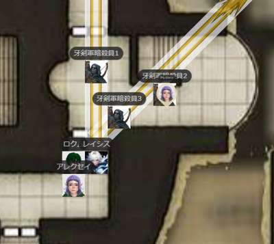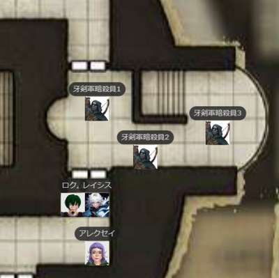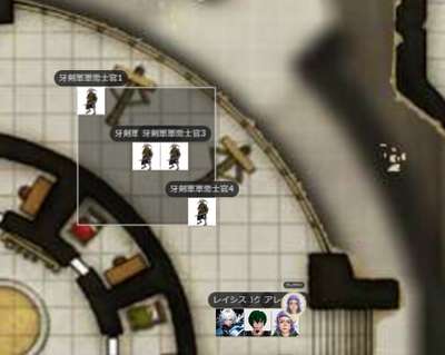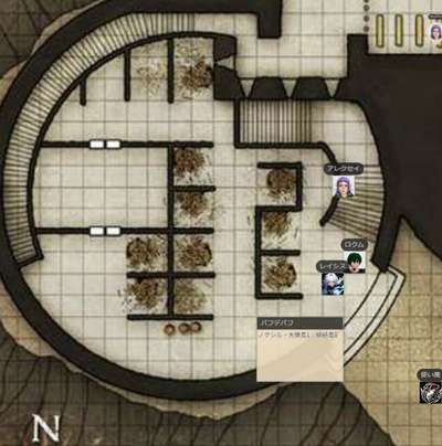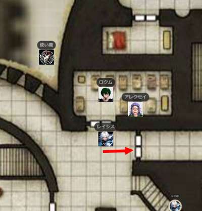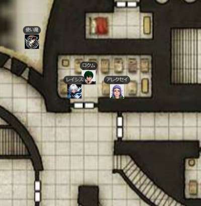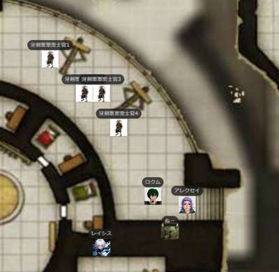 ●A.I 241/1/7 朝 ヴォルト地界 オニキス・フォートレス![]() GM:んじゃさっそくはじまりはじまり~ もうこれできりよく50回ですね! もしかしたら最後までいけるかなw レイシス:w ロクム:長かったなー レイシス:うむ GM:というわけで皆さんは汚い兵舎で、ここは誰も出て行ったままなのか、8時間休みとれました。hpとか戻していいですよ~。あとは食事とかですかね。(やるなら ロクム:ガバすぎるだろ GM:まぁまぁw レイシス:特に問題なさそうですね。アレクのHPとか戻るなら。 ロクム:ここから出て、どっちにいくかだな GM:では、引き続きラスダンなので、ご随意にお進みを~。 アレクセイ:こんなに誰も帰ってこないと、なんかろくでもない作業急がせてる気がー GM:どっちにしろ、それを止めにきたからなw レイシス:どっちですかね。 レイシス:こちらの扉からは、なにか聞こえます? ![]() GM:そっちですね。知覚どぞー レイシス:1d20+-1+8+5+2 知覚(WIS) <BCDice:レイシス>:DiceBot : (1D20-1+8+5+2) → 8[8]-1+8+5+2 → 22 レイシス:びみょい ロクム:こっちは下へ行く階段? GM:たまに敵兵の声しますねーそっちは。 レイシス:ここから先はさすが、人がいるのか GM:上がる階段ですねー ロクム:でも行き止まりっぽいな GM:<ロクム 今つい見せてしまいましたがw レイシス:ちょっと、そっちから行ってみます? アレクセイ:あ、儀式の闇を探すんだったかの術って、何かに使えない? GM:闇を探す術?・・なんだろう?w ロクム:妖精国行った時のやつか? GM:ああw アレクセイ:そうそう。 レイシス:ロケートデプス レイシス:かな? GM:はいはいw ありましたねw レイシス:次元界を超えて、特定の場所を探し出してその方角を示す。 その場所は儀式を行った本人が知らなくてもよい。 効果時間中は常に儀式を行った者の視界に、光で道筋が見える。 違う次元界にある場合は赤く点滅するだけであるが、同じ次元界にある場合は黄色い薄い光でその場所の最短距離が指し示される。 GM:方向か。了解ですー レイシス:将軍の居場所とかわかるんだろうか。 GM:やってみます? ロクム:やってみよう レイシス:やってみまーす アレクセイ:深淵を探す方か。あーこれ手が指さす術の上級版なのか。 GM:はーい そうそう<上級版 ではやってみると レイシス:なるほど GM:方向は、わずか南の下をさしたね! レイシス:こちら? ロクム:上ではなく下か GM:最短距離だから、壁つきぬけちゃうけどw アレクセイ:上か下かだけでもわかっただけまし。 ロクム:地下とか? GM:これの、やや下ですねw GM:今、ここ2Fなんすよね ロクム:1Fかな レイシス:角度は、地下方向ってことですか? GM:ここよりは下ですね。あ、今そこにいるならこうなるかなw ![]() レイシス:なるほど。 GM:さぁ、方角がわかったところで、どうするか! ロクム:下へ行く階段を探すか レイシス:ですねぇ アレクセイ:って事でまずは下向きの階段でしょ。 レイシス:とりあえず、この扉を聞き耳すると。。なにか聞こえます? GM:はーい そっちですね。レイシスが聞き耳すると ロクム:油余ってるし、こっちの上り階段に油でも撒いておこう レイシス:1d20+-1+8+5+2 知覚(WIS) <BCDice:レイシス>:DiceBot : (1D20-1+8+5+2) → 19[19]-1+8+5+2 → 33 レイシス:w GM:・・「第二軍はどうなってる!」「敗北してます!撤退中!」「ええい、くそ」 GM:となんか作戦室で議論めいた声が・・ホブゴブですね レイシス:(あ、なんかいっぱいいそう ロクム:(ファーエンダー側でも頑張ってるのかな レイシス:(ですかね。 GM:こっちの混乱もあって、だいぶ巻き返しに成功しているようでw アレクセイ:「女王の指示は出てます?居ればここでおしまいだけど...」 ロクム:(会話的に居なさそう ロクム:(突撃する? レイシス:(してみますか レイシス:(もしくは、目ん玉だしてもいいですが ロクム:1d20+8+0+8+2+5+5 【隠密】 <BCDice:ロクム>:DiceBot : (1D20+8+0+8+2+5+5) → 12[12]+8+0+8+2+5+5 → 40 GM:お、では不意打ちですねw 隠密する方はどぞ レイシス:1d20+5+0+8+5 隠密(DEX) <BCDice:レイシス>:DiceBot : (1D20+5+0+8+5) → 16[16]+5+0+8+5 → 34 アレクセイ:ここ潰すと表の人たちが楽できるのは確かだけど、こいつらが黙って女王が気付くとこっちの仕事がやりにくくなりそう。 ロクム:止めとくか?女王一直線コース? アレクセイ:8時間も寝てるので、急いだ方が良い気がする。 レイシス:なんか幹部っぽい人たちばっかりだな GM:なんか隊長たちと共に、脳筋そうなホブゴブが指揮してますね! ![]() GM:ここは作戦室のようです!そう、幹部らの作戦会議中だった模様! ノクシル:1d20+-1+6 知覚 <BCDice:ノクシル>:DiceBot : (1D20-1+6) → 1[1]-1+6 → 6 レイシス:(鈍感だった模様 GM:あ、隠密はたぶんみんな成功。不意打ちはできますw GM:しかけます?どうします? レイシス:じゃあ、一発かましちゃいますか レイシス:いいですか? アレクセイ:そうだね。 GM:どうぞ! まずはいにしあw GM:そして不意打ちターンですw レイシス:1d20+5+8+4 イニシアチブ <BCDice:レイシス>:DiceBot : (1D20+5+8+4) → 3[3]+5+8+4 → 20 ロクム:1d20+8+8+2+2 イニシアチブ <BCDice:ロクム>:DiceBot : (1D20+8+8+2+2) → 5[5]+8+8+2+2 → 25 ノクシル:1d20