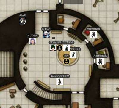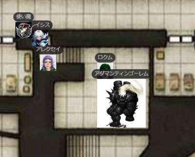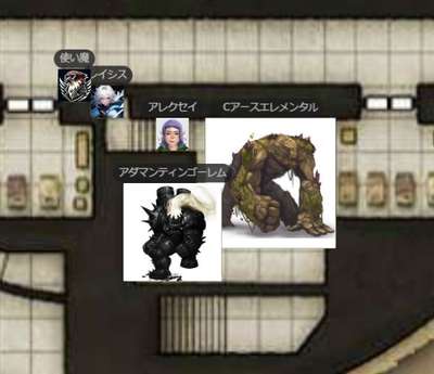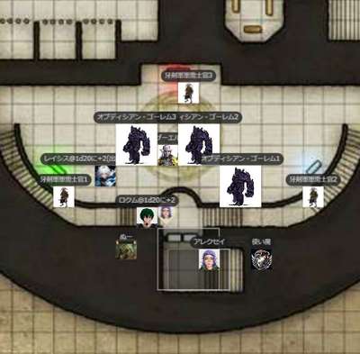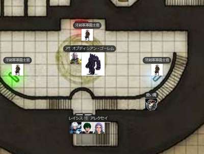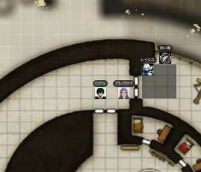 | ●A.I 241/1/7 夕方 ヴォルト地界 オニキス・フォートレス GM:さて、ではとっととはじめましょうか!いよいよこれも佳境です。ええと、前回どうも、このスタート位置で終わっているようなんですがw レイシス:あ、そですね ![]() GM:まだ、真ん中の部屋は入ってない・・ですねw そこのバリスタを用意していた科学士官を何体か倒したところですね。 ロクム:スピークウィズデッドで居場所を聞き出したところだな GM:そうそう ロクム:あとなんかボヤボヤしてるとヤバいことを起こしそうな情報 GM:んでやや下のほうにアザー女王はいるという事でしたが、その秘密の部屋があるというとか。そうですね。なので急ぎ彼女の場所を探して倒さねばw ロクム:「入ってみよーぜ」(ドア開いてる? レイシス:「そうだね」 GM:というわけで、まぁそこは開いたでいでしょうー。んで、広い曲がった廊下にでます~。幸い敵はなし。 ロクム:1d20+2+8+5 +2 【知覚】 <BCDice:ロクム>:DiceBot : (1D20+2+8+5) → 2[2]+2+8+5 → 17 ロクム:誰もいないのか レイシス:1d20+-1+8+5+2 知覚(WIS) <BCDice:レイシス>:DiceBot : (1D20-1+8+5+2) → 3[3]-1+8+5+2 → 17 ![]() GM:あ、その上の廊下が誰もいないだけw んで、真ん中ですねw チェックすることもなくw レイシス:おっと、さすがにいますか GM:はいw ええとですね ロクム:生贄にでもするのか? GM:一人のムキムキなホブゴブリンが、君たちのほうの円形の闘技場で、囚人と部下が戦っているところを大笑いしてみている。女ホブゴブリンモンクですね!だが、君たちに気づくと、驚いて構えだした! ロクム:そこ、闘技場なんだ GM:はいw 囚人はやはり人間たちだ。ではいにしあー レイシス:檻みたいになってるんですかね アレクセイ:1d20+2+8 イニシアチブ <BCDice:アレクセイ>:DiceBot : (1D20+2+8) → 12[12]+2+8 → 22 レイシス:1d20+5+8+4 イニシアチブ <BCDice:レイシス>:DiceBot : (1D20+5+8+4) → 10[10]+5+8+4 → 27 ロクム:1d20+8+8+2+2 イニシアチブ <BCDice:ロクム>:DiceBot : (1D20+8+8+2+2) → 16[16]+8+8+2+2 → 36 ホブゴブリンモンク:1d20+8+7 イニシアチブ <BCDice:ホブゴブリンモンク>:DiceBot : (1D20+8+7) → 9[9]+8+7 → 24 牙剣軍特戦隊1:1d20+2+7 イニシアチブ <BCDice:牙剣軍特戦隊1>:DiceBot : (1D20+2+7) → 13[13]+2+7 → 22 ホブゴブリン:1d20+2+0 イニシアチブ <BCDice:ホブゴブリン>:DiceBot : (1D20+2+0) → 19[19]+2+0 → 21 GM:これで全部ですね!部屋からもでそうです! レイシス:ホブさんは、Lv1なんですね。 ロクム:ホブゴ弱いな GM:では、みんな振ったかなー。そ、新兵は囚人相手にやってたみたいw<LV1 レイシス:なるほど GM:では開始ー! ロクムからどぞ ロクム:うぇーい ロクム:・ブレード・ヴォールト pp:3 主○ DEX vs AC 近接 オーラ2内の敵全て 2w+DEX「武器」 オート:攻撃前に3マスの跳躍(シフト扱い)が行える。 ロクム:1d20+8+8+1+5 vs AC ブレード・ヴォールト(軽刀剣類) <BCDice:ロクム>:DiceBot : (1D20+8+8+1+5) → 15[15]+8+8+1+5 → 37 ロクム:2d7+4+8+1+5+1 ブレード・ヴォールトダメ(有利時はこれに+1) <BCDice:ロクム>:DiceBot : (2D7+4+8+1+5+1) → 7[5,2]+4+8+1+5+1 → 26 GM:お、モンク狙い? GM:あ、ホブゴブのほうか ロクム:まずは雑魚散らし レイシス:消えたw GM:pp+4どぞw アレクセイ:ああ、囚人のイニシアが無い。 GM:囚人は最後にうごくよー ロクム:戦力にならないしな ロクム:おわり GM:レイシスどぞー レイシス:はーい アレクセイ:(モンクより早い訳無いしいいか) GM:ビームきたw モンク狙いすね。どぞ レイシス:7LV|●アーク・オブ・ライトニング(arc of lightining)|pp:5|vs RC|行動(主)|タグ(「黒魔法」「装具」)|属性(「電撃」)|トリガー(-)|攻撃(遠隔範囲)|目標(距離10以内のクリーチャー2体と、その2体間の直線上にいるクリーチャーすべて。)|効果(ミス:半減のみ)|解説(黒5lvのライトニングボルトよりも自由な直線が引けて、ダメージも大きい。)|ダメージ(1LV毎に1d8(電撃) MAX:14d8) レイシス:いってみます レイシス:1d20+4+8+5+5+2+1 vsRC アーツ命中(アーク・オブ・ライトニング) <BCDice:レイシス>:DiceBot : (1D20+4+8+5+5+2+1) → 7[7]+4+8+5+5+2+1 → 32 GM:あたりー レイシス:あぶな レイシス:14d8+5 雷撃ダメージ (アーク・オブ・ライトニング) <BCDice:レイシス>:DiceBot : (14D8+5) → 72[6,7,8,1,7,4,7,3,4,8,8,6,1,2]+5 → 77 GM:うごw レイシス:あ、ここだと邪魔かな GM:あ、アレクが次ビームあたりくるかな? アレクセイ:アストラルテラーで一発落ち狙うのでどこでもいいかも レイシス:あ、了解 レイシス:じゃあ、この辺で GM:移動で終わりかな? レイシス:はい GM:ではモンク― 目の前にきちゃったから、レイシスに! ホブゴブリンモンク:1d20+19 vsAC 拳攻撃x3 <BCDice:ホブゴブリンモンク>:DiceBot : (1D20+19) → 4[4]+19 → 23 ホブゴブリンモンク:1d20+19 vsAC 拳攻撃x3 <BCDice:ホブゴブリンモンク>:DiceBot : (1D20+19) → 11[11]+19 → 30 ホブゴブリンモンク:1d20+19 vsAC 拳攻撃x3 <BCDice:ホブゴブリンモンク>:DiceBot : (1D20+19) → 10[10]+19 → 29 GM:ふるわないw レイシス:びみょい GM:アレクどぞ アレクセイ:アストラルテラーvsMC アレクセイ:1d20+10+8+5 vsMC ディスコーダント・スピリットp3 <BCDice:アレクセイ>:DiceBot : (1D20+10+8+5) → 2[2]+10+8+5 → 25 GM:さすがに外しかな レイシス:出目が ア
